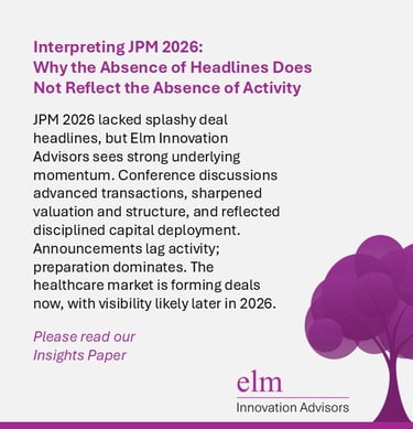 JPM 2026 lacked splashy deal headlines, but Elm Innovation Advisors sees strong underlying momentum. Conference discussions advanced transactions, sharpened valuation and structure, and reflected disciplined capital deployment. Announcements lag activity; preparation dominates. The healthcare market is forming deals now, with visibility likely later in 2026.